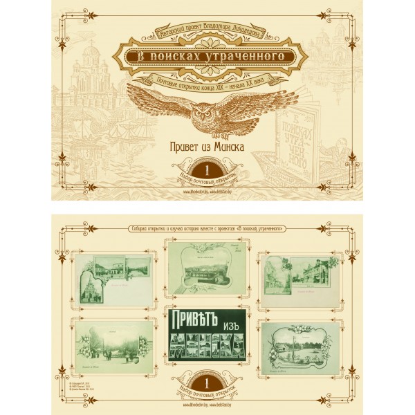 Авторский проект Владимира Лиходедова «В поисках утраченного» основан на его уникальной, не имеющей аналогов в мире коллекции почтовых открыток и фотографий конца XIX – начала XX веков, посвященных истории Беларуси. Коллекция насчитывает около 30 тысяч фотографических раритетов и постоянно пополняется. Сувенирный набор состоит из шести открыток, отображающих исторические места Беларуси конца XIX – начала XX веков. Предполагается выпуск нескольких тысяч различных наборов ограниченным тиражом. Предлагаем Вам собрать открытки и изучать историю вместе с проектом «В поисках утраченного».