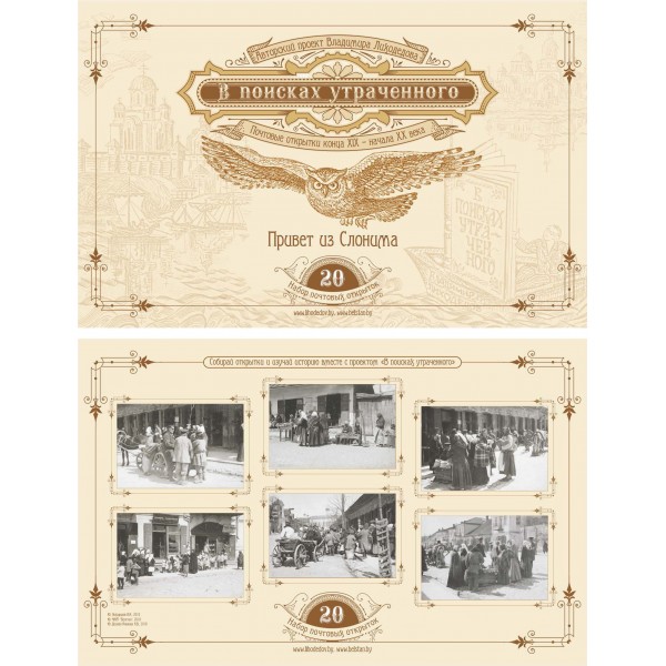 Авторский проект Владимира Лиходедова «В поисках утраченного» основан на его уникальной, не имеющей аналогов в мире коллекции почтовых открыток и фотографий конца XIX – начала XX веков, посвященных истории Беларуси. Коллекция насчитывает около 30 тысяч фотографических раритетов и постоянно пополняется. Сувенирный набор состоит из шести открыток, отображающих исторические места Беларуси конца XIX – начала XX веков. Предполагается выпуск нескольких тысяч различных наборов ограниченным тиражом. Предлагаем Вам собрать открытки и изучать историю вместе с проектом «В поисках утраченного».