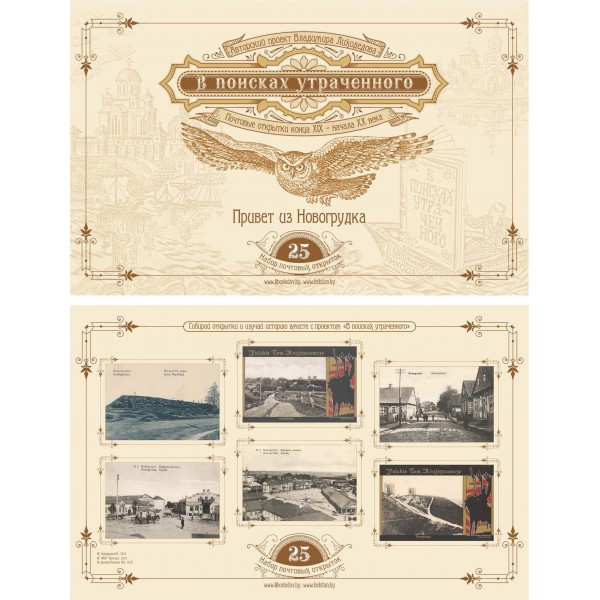 Авторский проект Владимира Лиходедова «В поисках утраченного» основан на его уникальной, не имеющей аналогов в мире коллекции почтовых открыток и фотографий конца XIX – начала XX веков, посвященных истории Беларуси. Коллекция насчитывает около 30 тысяч фотографических раритетов и постоянно пополняется. Сувенирный набор состоит из шести открыток, отображающих исторические места Беларуси конца XIX – начала XX веков. Предполагается выпуск нескольких тысяч различных наборов ограниченным тиражом. Предлагаем Вам собрать открытки и изучать историю вместе с проектом «В поисках утраченного».