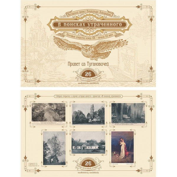 Авторский проект Владимира Лиходедова «В поисках утраченного» основан на его уникальной, не имеющей аналогов в мире коллекции почтовых открыток и фотографий конца XIX – начала XX веков, посвященных истории Беларуси. Коллекция насчитывает около 30 тысяч фотографических раритетов и постоянно пополняется. Сувенирный набор состоит из шести открыток, отображающих исторические места Беларуси конца XIX – начала XX веков. Предполагается выпуск нескольких тысяч различных наборов ограниченным тиражом. Предлагаем Вам собрать открытки и изучать историю вместе с проектом «В поисках утраченного».